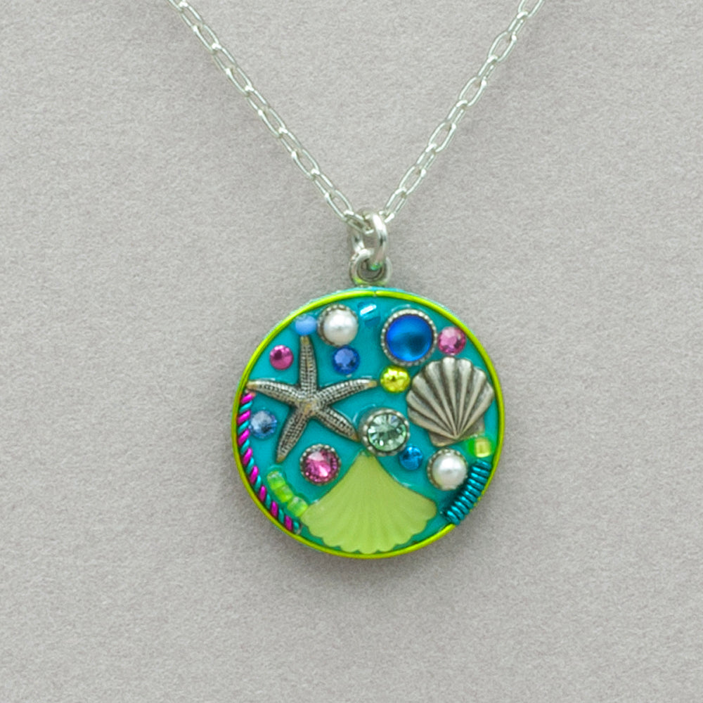 This intricately embellished mosaic necklace is comprised of European glass crystals and various other materials. Adjustable silver plated chain measures 15 3/4" to 18". Pendant drop 1/2" diameter. ff 9255