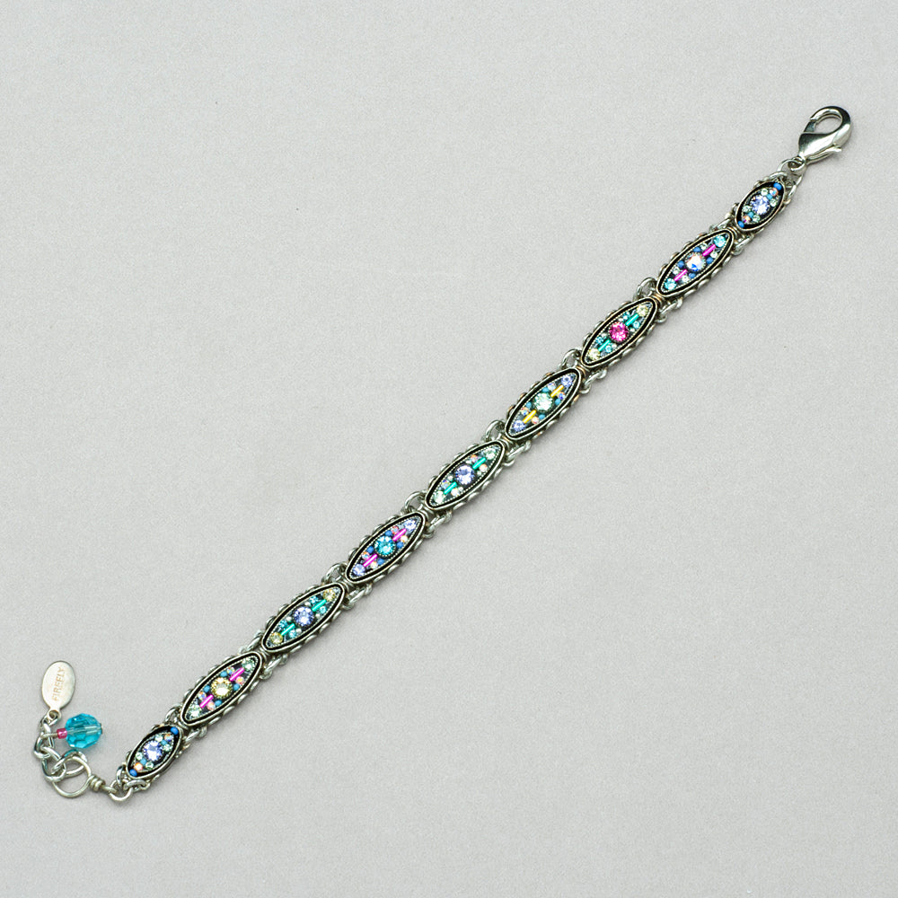 This intricately embellished mosaic bracelet comprises European glass crystals and beads. Lobster clasp. Adjustable rhodium-plated chain 6 1/2" to 7 1/2" long. Measures 1/4" wide. ff 3159