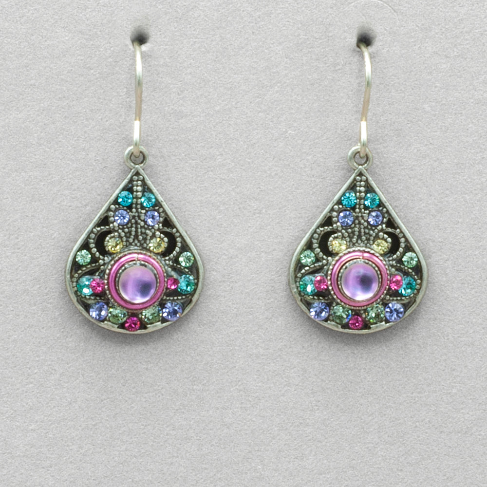 Made in Guatemala, these beautiful earrings feature Czech crystals and various other materials in an intricate mosaic design. Sterling silver ear wires. Measures 1 1/4" long by 5/8" wide. ff 7955