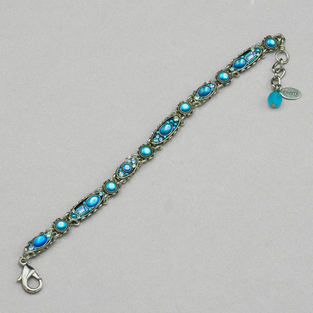 This intricately embellished mosaic bracelet comprises European glass crystals and beads. Lobster clasp. Adjustable rhodium-plated chain 7" to 8" long. ff 3183