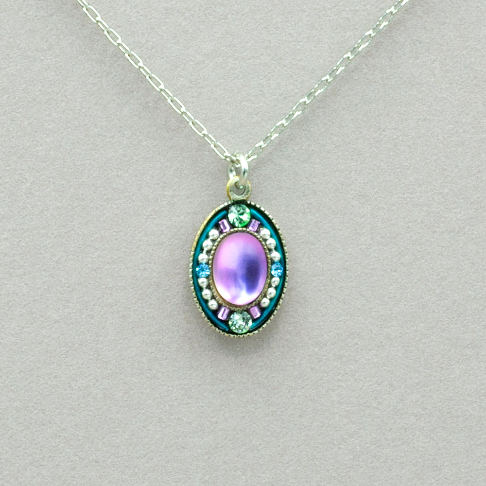 This intricately embellished mosaic necklace is comprised of European glass crystals and various other materials. Adjustable silver plated chain measures: 15 3/4" to 18". ff 9173