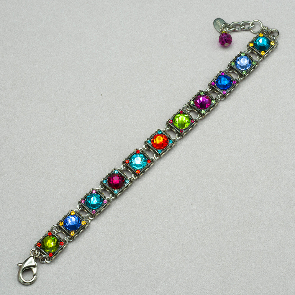This colorful bracelet comprises European crystals and various other materials in an intricate mosaic design. Lobster clasp. Bracelet is adjustable, from 7" to 8". Measures 1/2" wide at the widest point. ff 3149