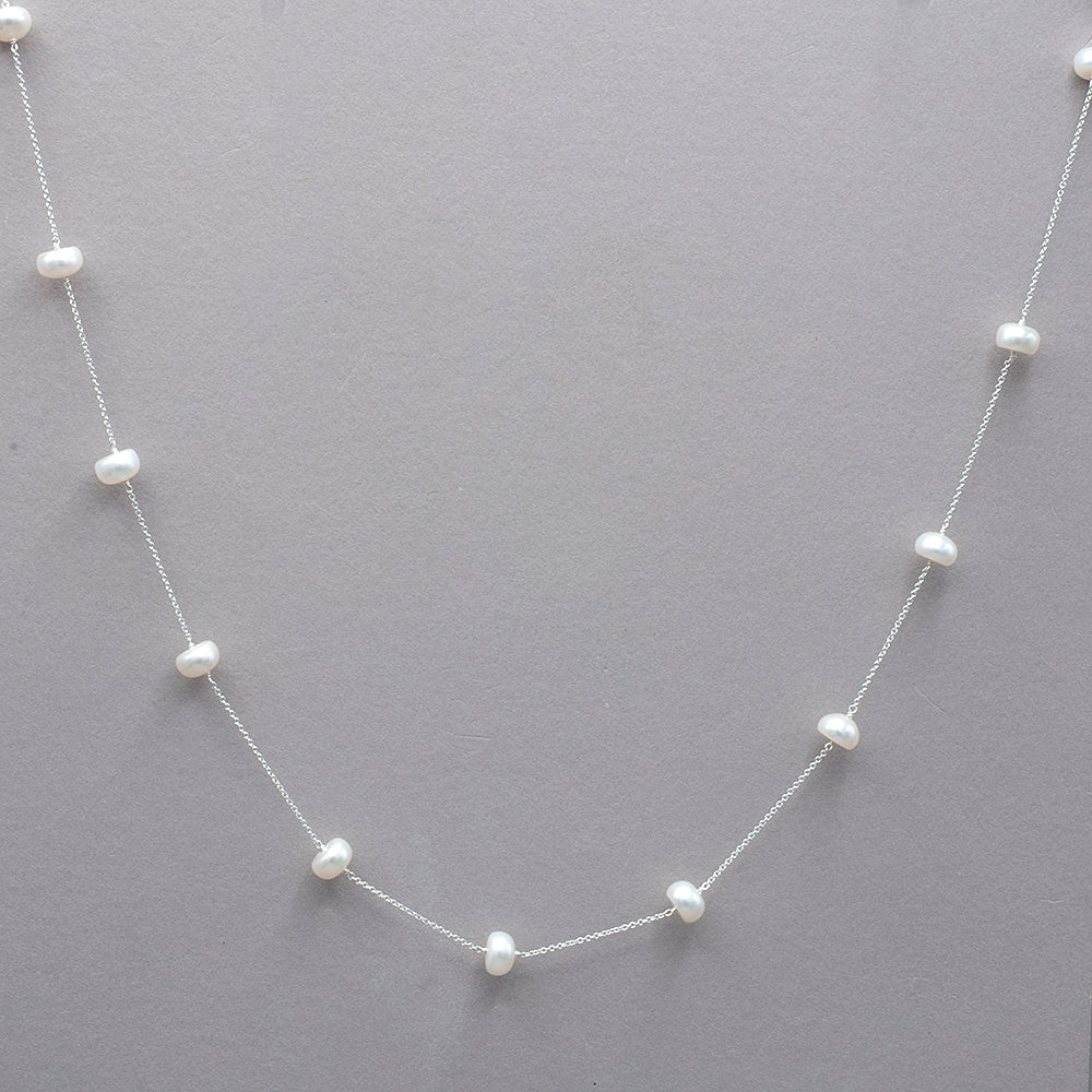 Selection of high luster, button-shaped cream-color freshwater pearls, hand-wrapped at irregular intervals onto delicate sterling silver cable chain by Denise Peacock of Delisch. Hand-formed signature Delisch s-shaped clasp. Measures 20" long. de nk0136