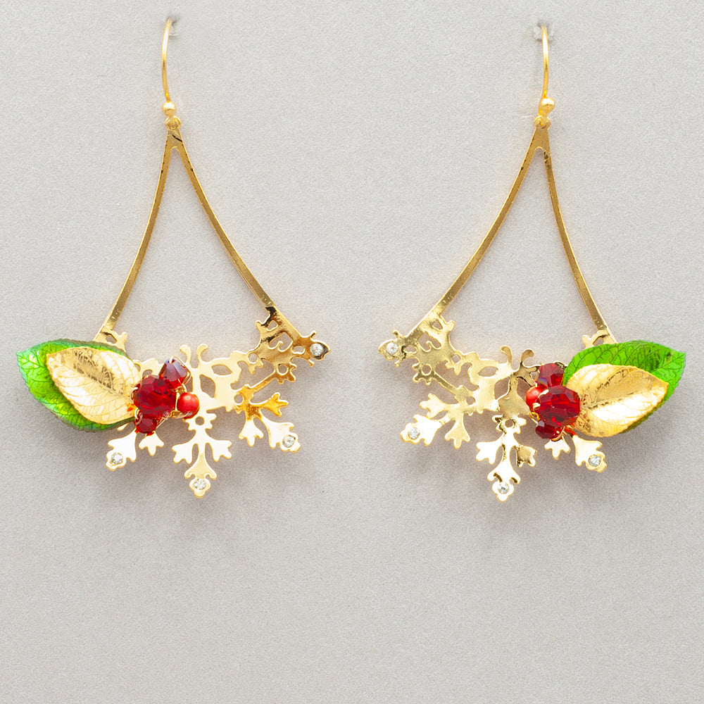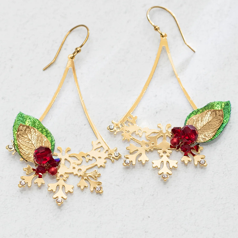 Striking a festive note, the Boughs Of Holly Earrings are a yuletide symphony of 18-karat gold snowflakes, twinkling crystals, and colorful glass and pearl beads. Crowned with leaves in the merriest shade of green, their yesteryear charm chimes brightly for endless occasions. 18K gold-plated, niobium, crystal, vegan pearls. Measures: 2 1/2" l. × 1 1/2" w. hy 10023217lg
