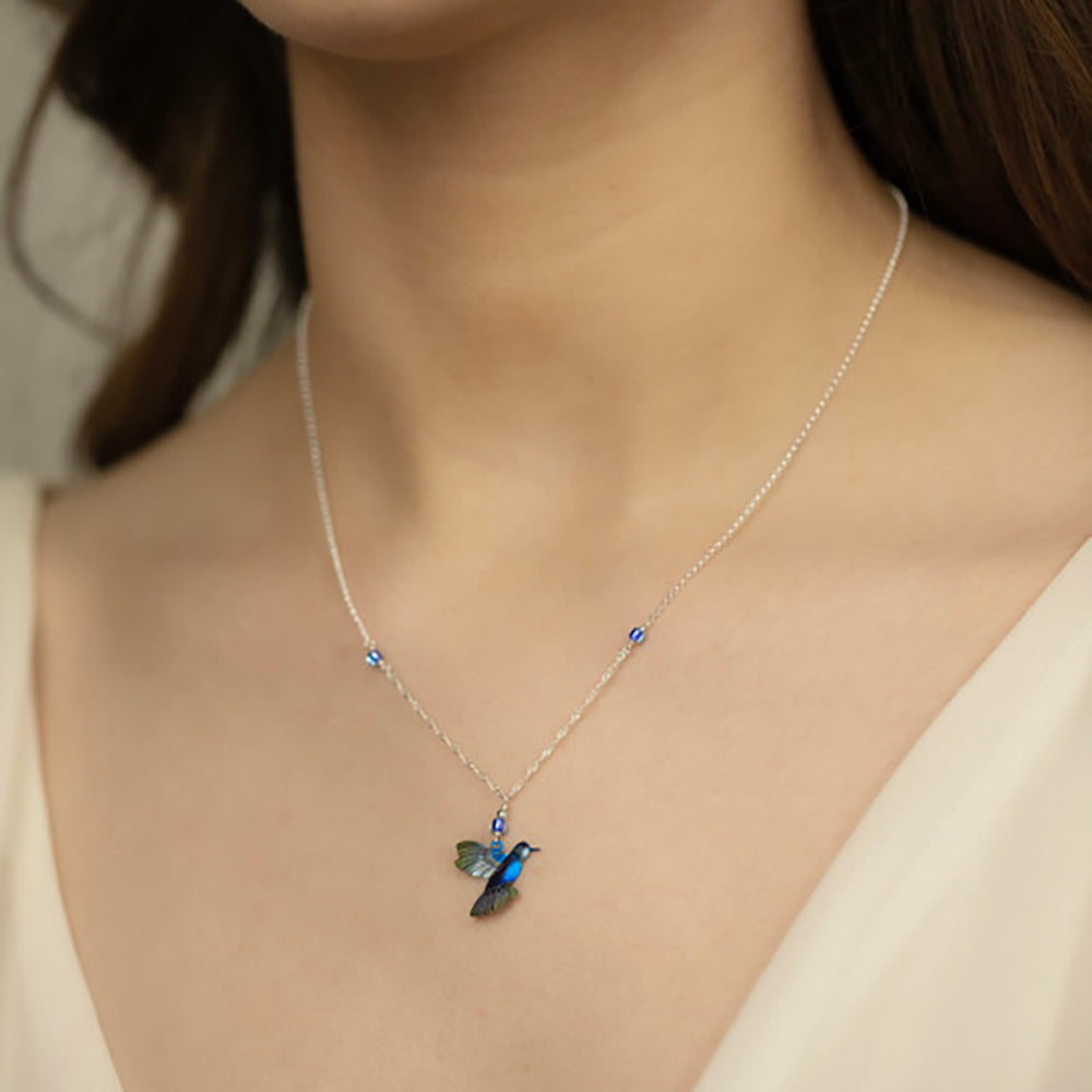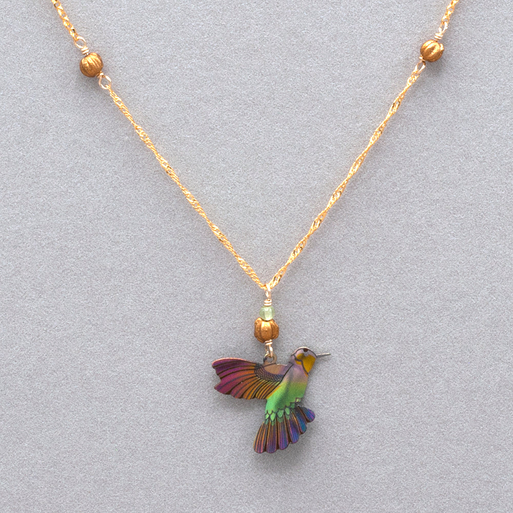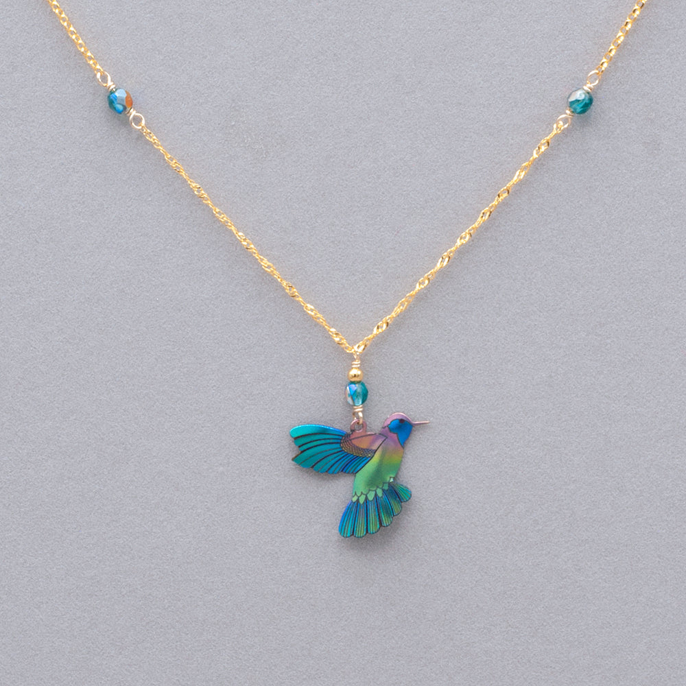 Hummingbirds have long been regarded as symbols of luck and messengers of love. Quick as a flash, it's not likely you'll see one perched or sitting still. Their infinite energy is an inspiration, as is their vivacious palette of colors. Niobium's radiant glow brings extra definition to their feather's striking hues, making this pendant a treat for the eyes and a treasure for the heart. Niobium, bohemian glass, and an 18k gold-plated or silver-plated chain. Adjustable 16-20" long, pendant measures 2" long by 3/4" wide.