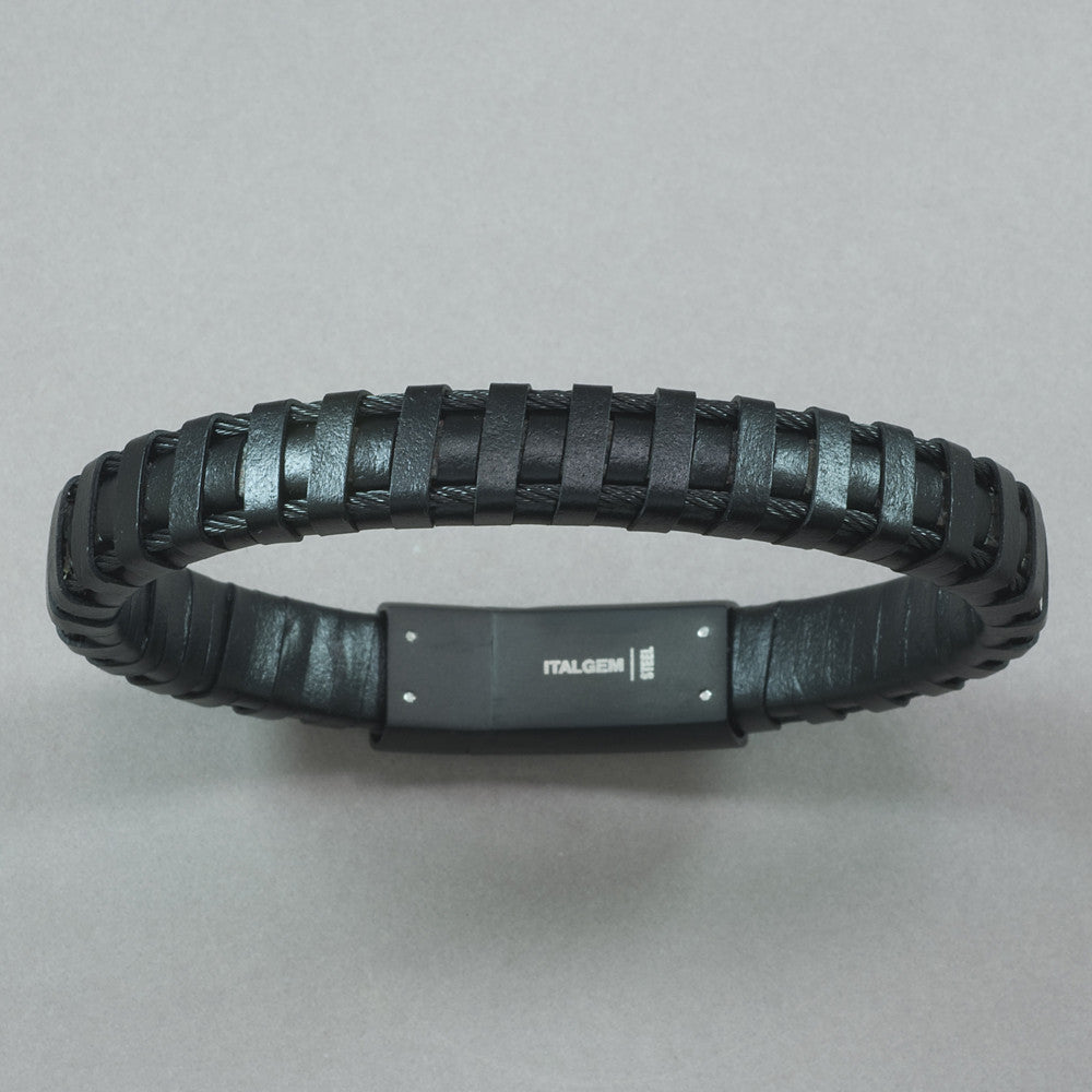 Italgem Black Leather with Black IP Stainless Steel Bracelet