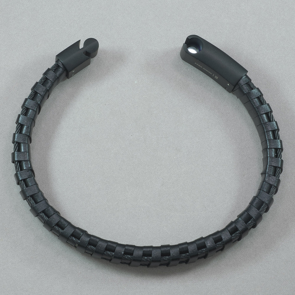 Black iron-plated matte stainless steel clasp with black leather bracelet. Measures 8.5" around. ital slb 303