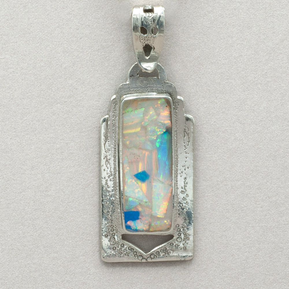 One of a kind mosaic stone created from pieces of opal, set in a unique embossed sterling silver pendant. Measures 2 1/4" long by 7/8" wide. jk p420