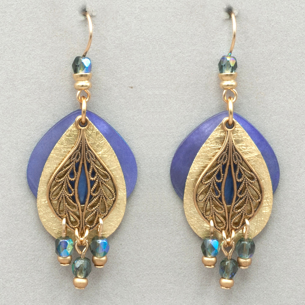 These beautiful earrings are made of gold-tone plated metals with beaded accents and dyed abalone. With surgical steel ear wires. Measures 2.25" long by 1" wide.jmr 4020