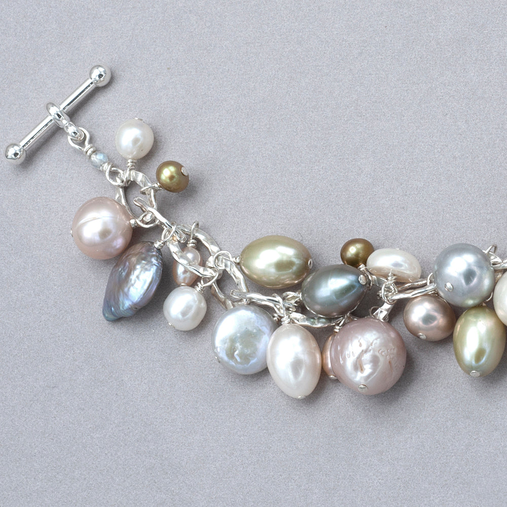 Pastel Pearls on Hammered Sterling Silver Chain Bracelet