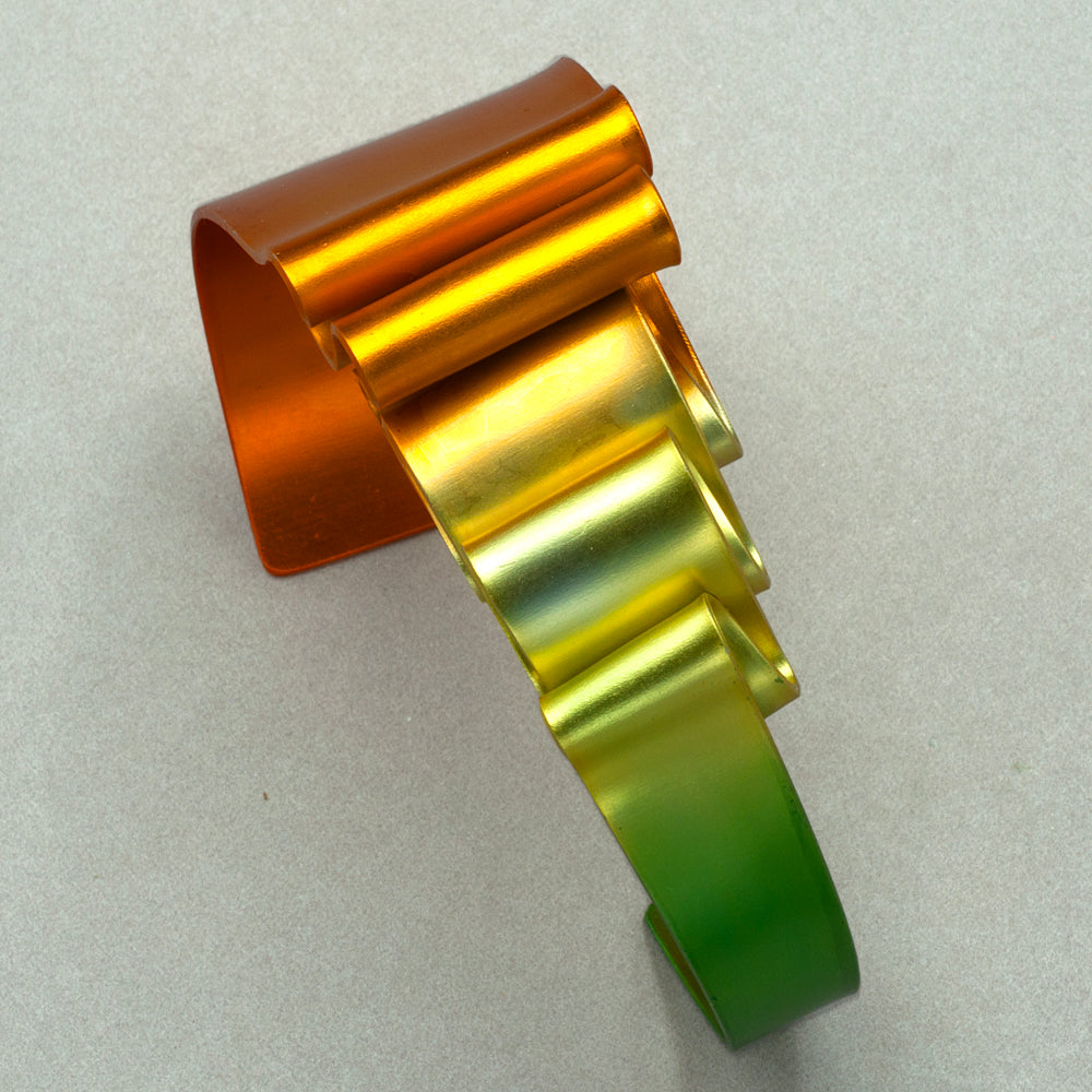 Anodized aluminum open cuff bracelet. Adjustable/bendable, measures about 2 1/2" across, 1 1/8" at the thickest end, with a 1 1/4" wide opening. sh wnc2