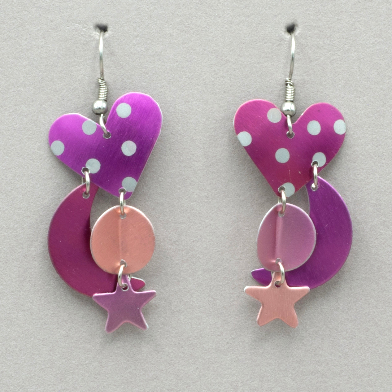 Hearts, stars and moons - what's not to like? Anodized aluminum on surgical steel ear wires. Measures 3/4" W x 2 1/4" L. sh hhs2