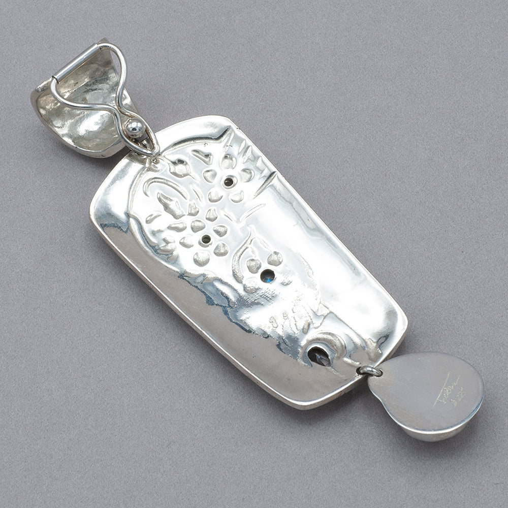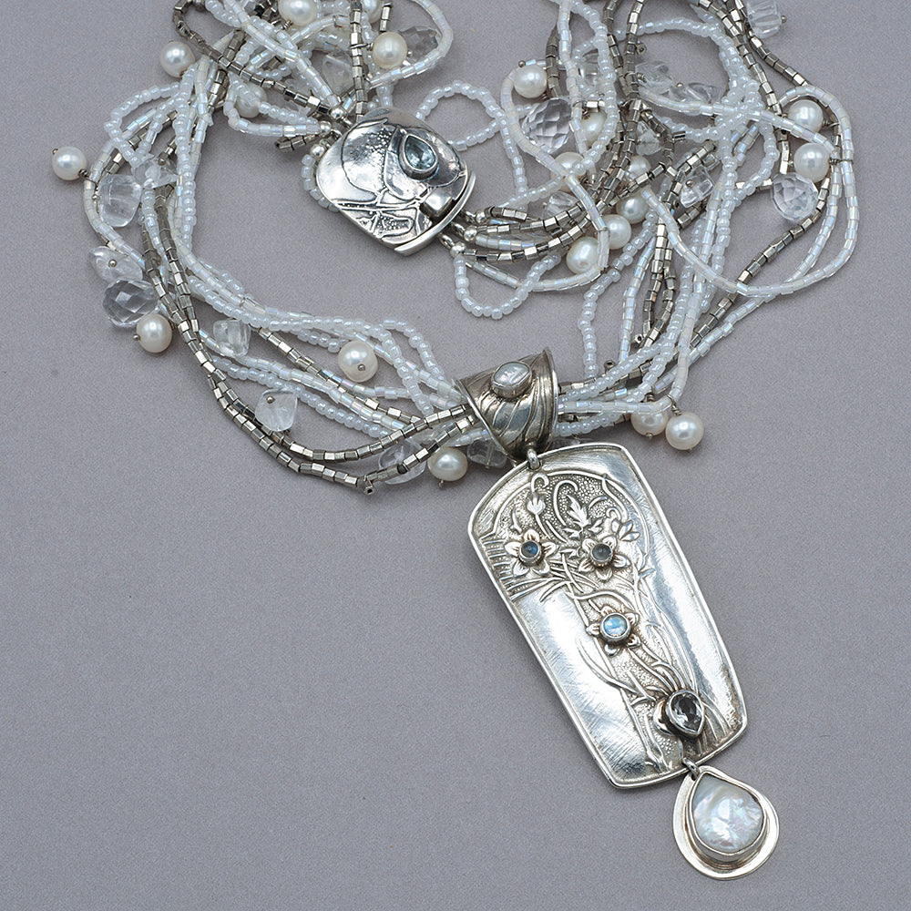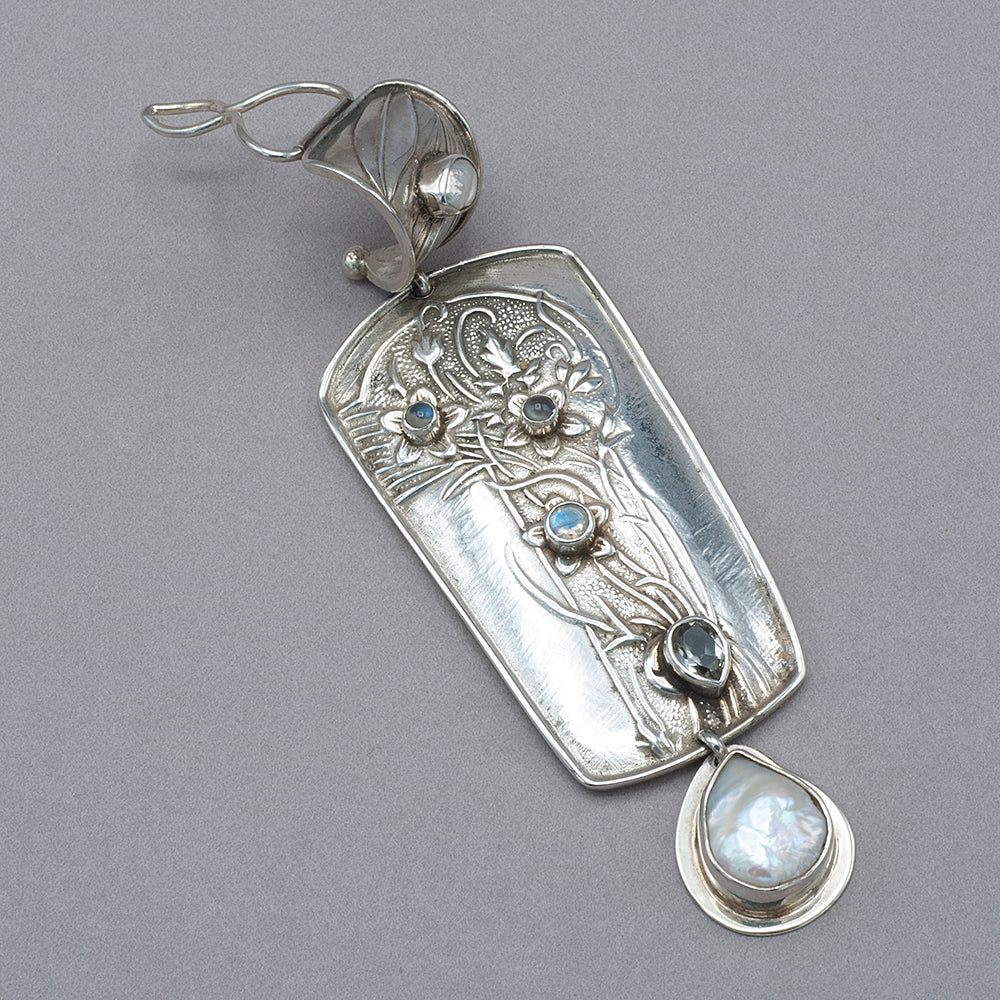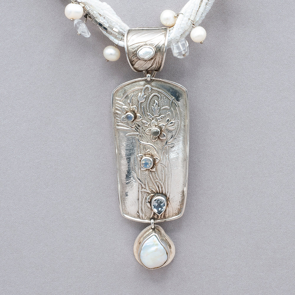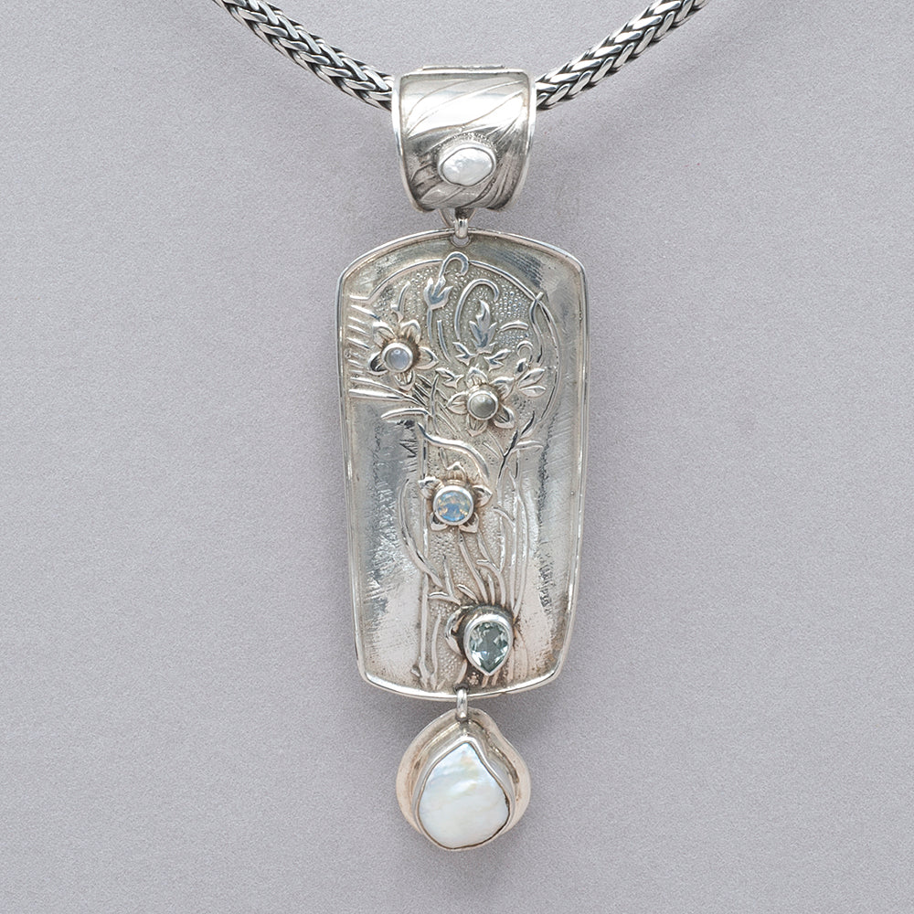 Stunning pendant that clips on a chain or a necklaces. Freshwater pearls, faceted rainbow moonstone, teardrop aquamarine all set in embossed sterling silver enhancer. Measures: 1 1/4"W x 3 1/2"L. sku rbj bbpe1