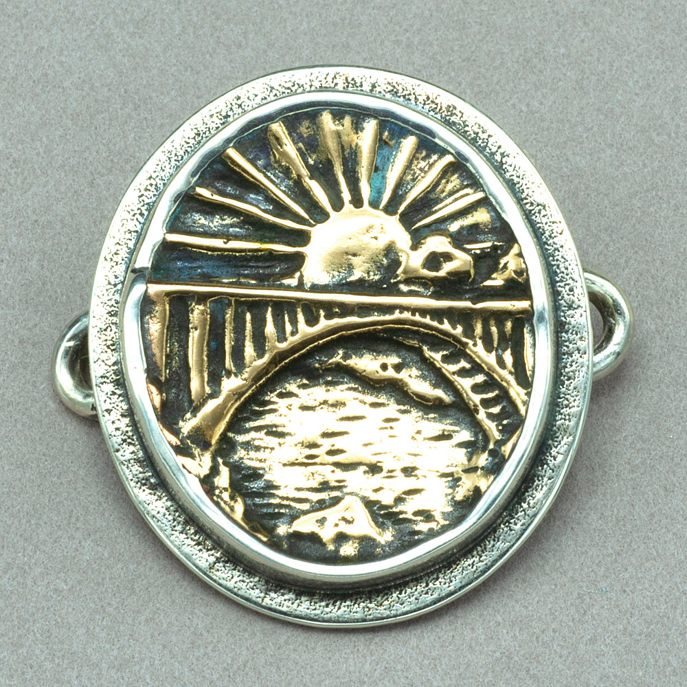 Cast bronze of Jim Kelly's "Rainbow Bridge" is set in textured sterling silver. Measures 1 1/4" wide by 1 1/8" long. Chains are sold separately. Shown on bracelet CBR35 anklet AK24. ti ch1458