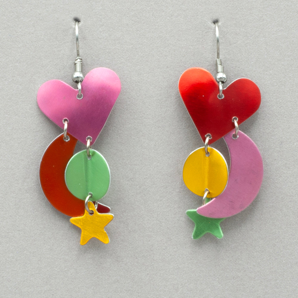 Hearts, stars and moons - what's not to like? Anodized aluminum on surgical steel ear wires. Measures 3/4" W x 2 1/4" L. sh hhs2