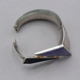 Sugilite and black matte onyx set on hollow curved sterling silver cuff bracelet with 18-karat gold accents. Closed cuff with a hinge and clasp. One of a kind. Estimated retail value $3,200. 1 1/4" wide, 2 5/8" across, clasp opens up 1 7/8". Created by Diane Egbert in 1996. mb b200