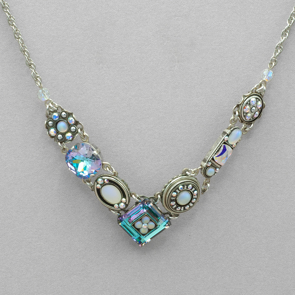 Made in Guatemala, this beautiful necklace comprises European crystals and various other materials in an intricate mosaic design. Lobster clasp. Necklace adjustable from 15 1/2" to 17" long. ff 8411