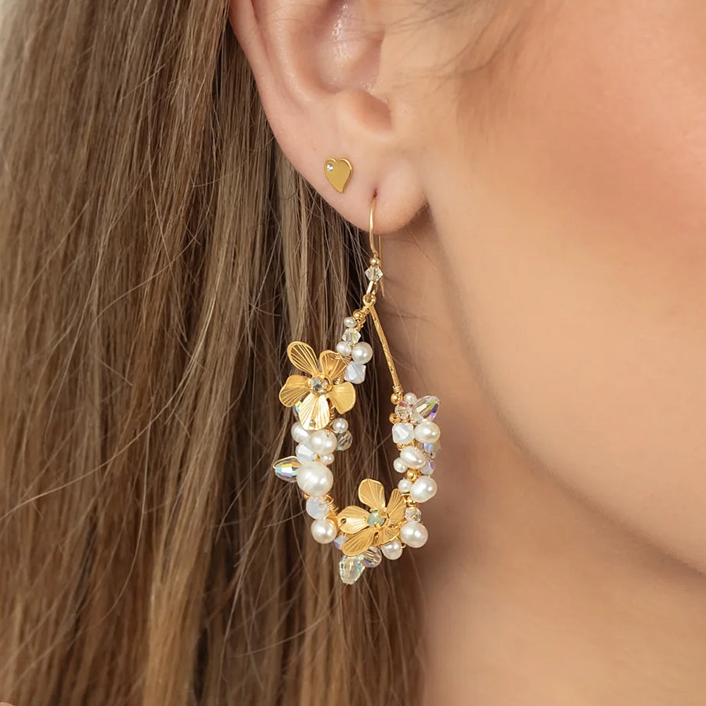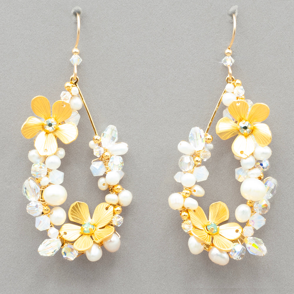 Rafaela earrings are bold and beautiful. These large earrings are truly unique and wonderfully creative, with their cluster arrangement of plumerias, crystals, and freshwater pearls. 18K Gold-plated with gold fill ear wires. Measures: 2 1/2" l. × 1 1/4" w.
