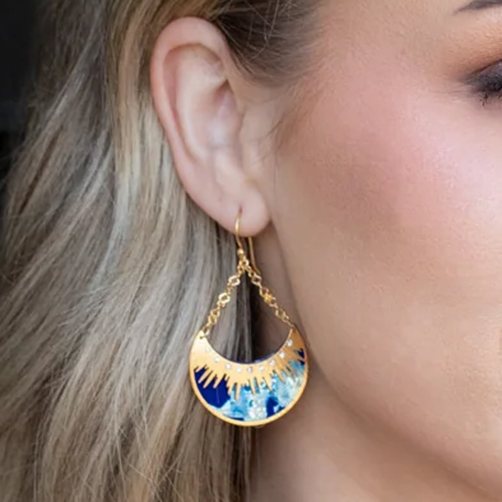 Because fashion never takes a day off, the stellar Selena Earrings are on the rise to take a permanent place in your orbit. Set in gold and shaped like crescent moons, their pretty swing catches everything from sunlight to starlight with the twinkle of crystal stones and the vibrance of hand-dipped niobium. 18k gold-plated, niobium and glass crystal. Measures 2 1/4" long by 1 1/4" wide. hy 10045703lg