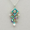 Made in Guatemala, this beautiful necklace features European crystals and various other materials in an intricate mosaic design. Chain adjustable from 16" to 18" L. Pendant: 5/8" W x 1 1/2" L. ff 9207
