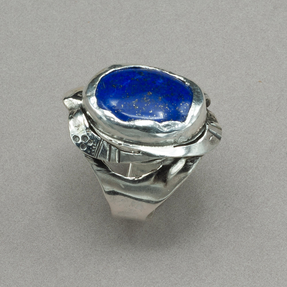 Lapis lazuli in a unique hand chased sterling silver setting by Jim Kelly. Designed to be worn by any adult. jk rg292