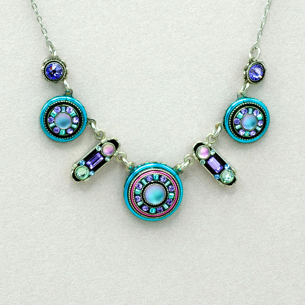 This intricately embellished mosaic necklace is comprised of European glass crystals and various other materials. Adjustable silver plated chain measures: 16" to 18". ff 9172