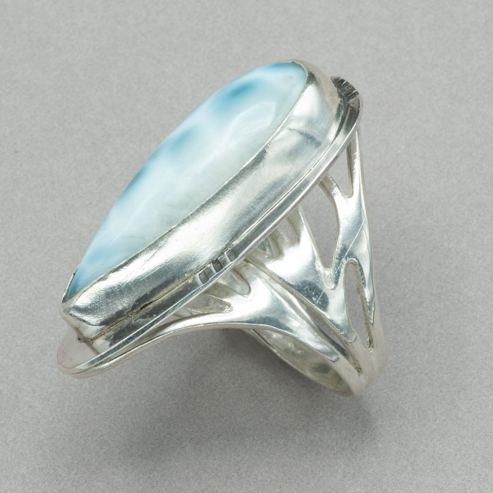 A long tear drop shaped larimar set on an original Jim Kelly sterling silver ring. jk rg293