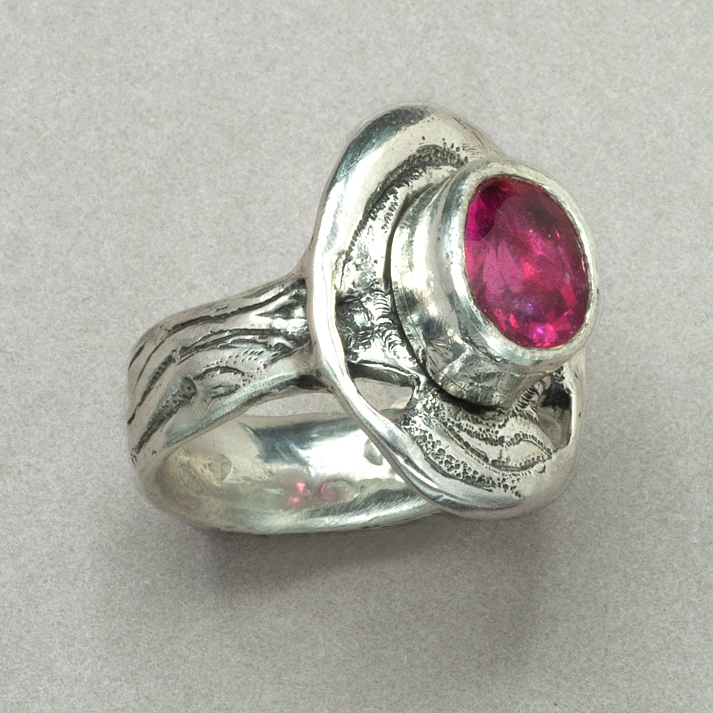 Lost wax cast one of a kind Jim Kelly sterling silver ring set with an oval faceted pink tourmaline. Like no other! Measures: 5/8" W x 7/8" L. The ring can be any size, the current size is 9.