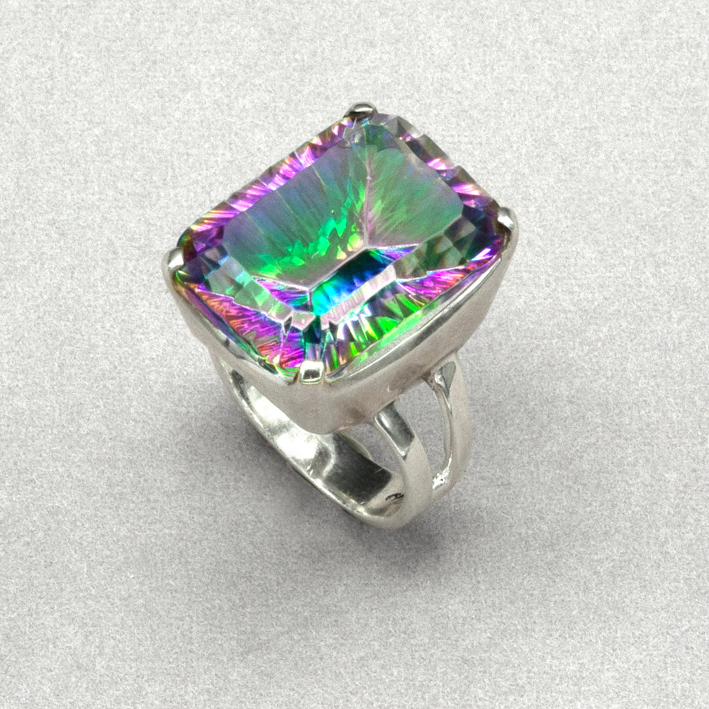 Large emerald cut mystic topaz stone set in sterling silver. Size 7 1/2.