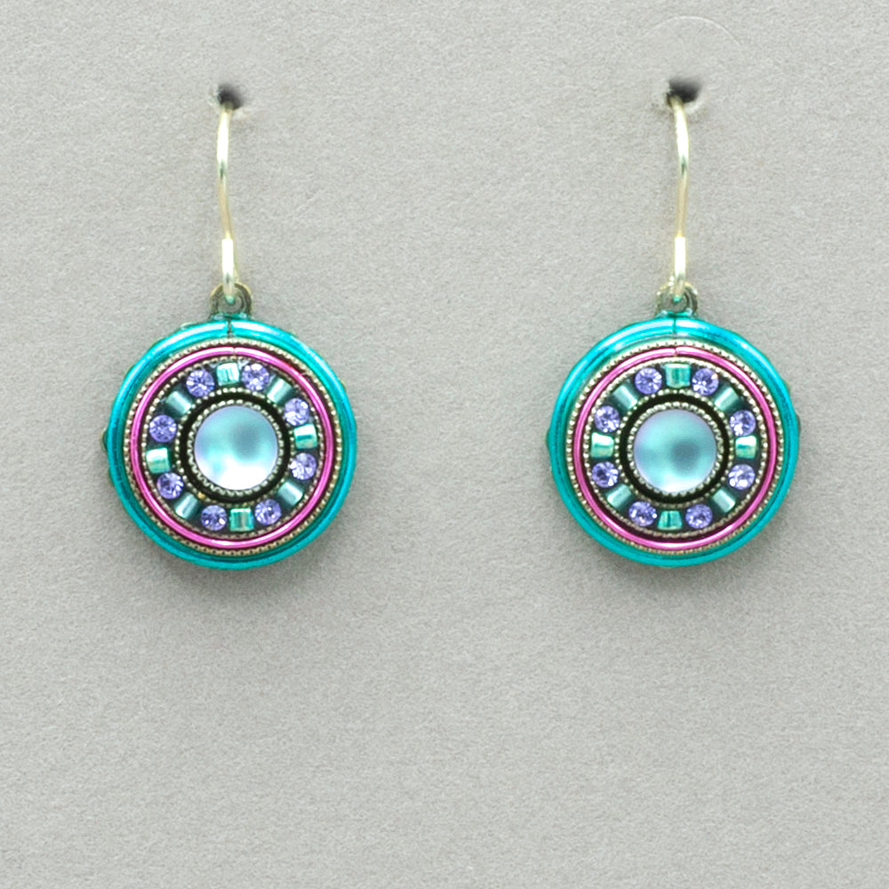 These intricately embellished mosaic earrings are comprised of European glass crystals and various other materials. Sterling ear wires. 1" long by 5/8" wide. ff e477