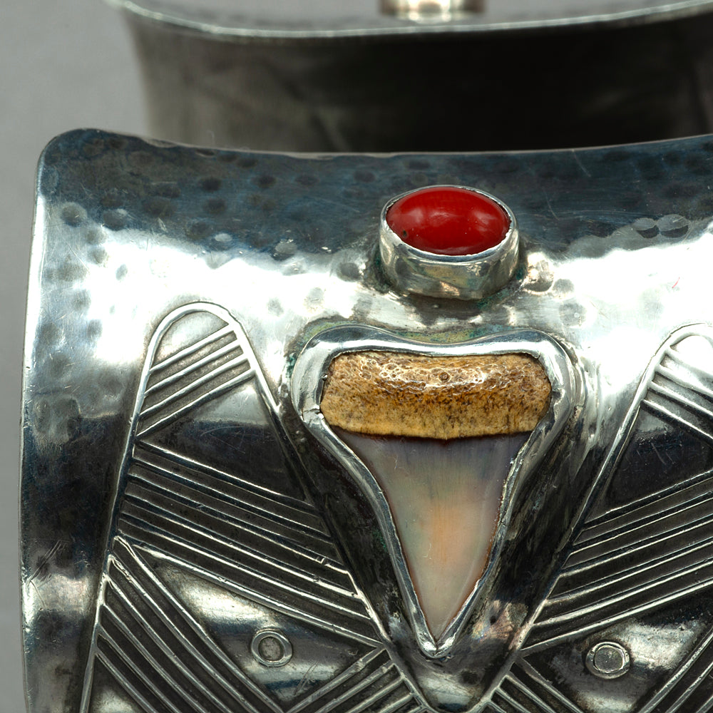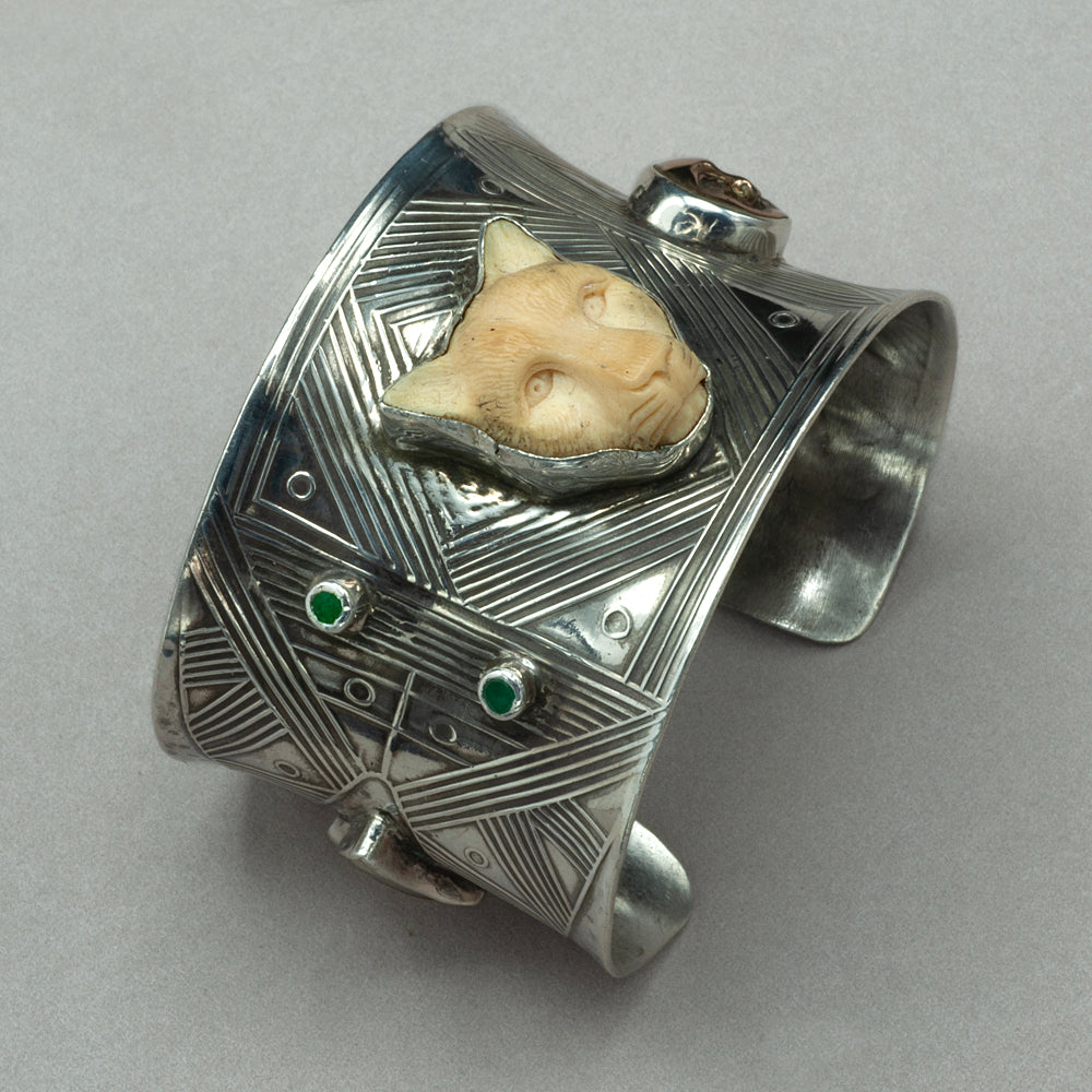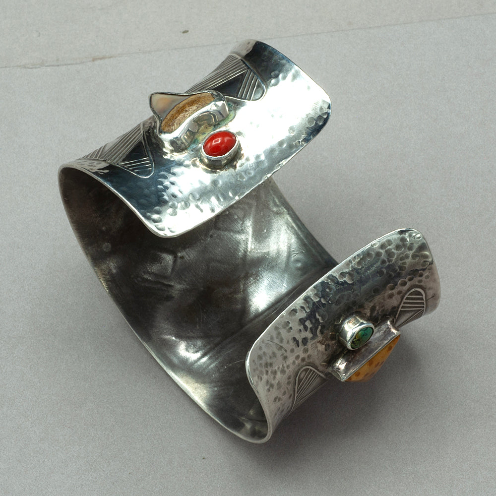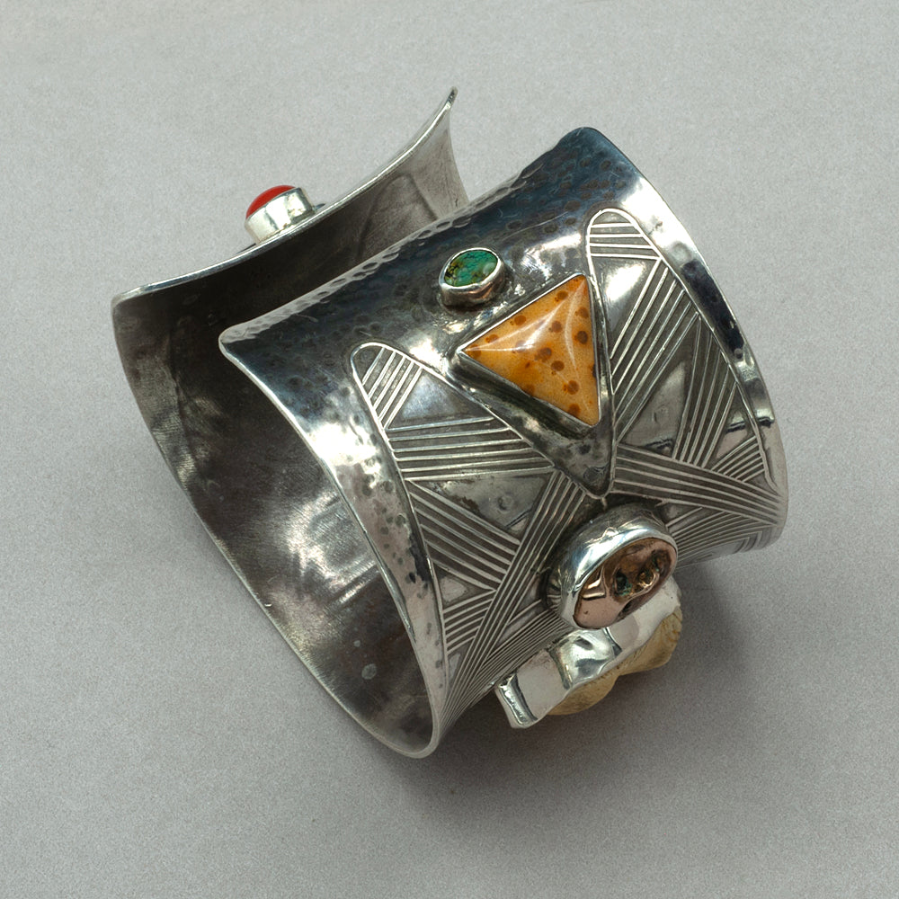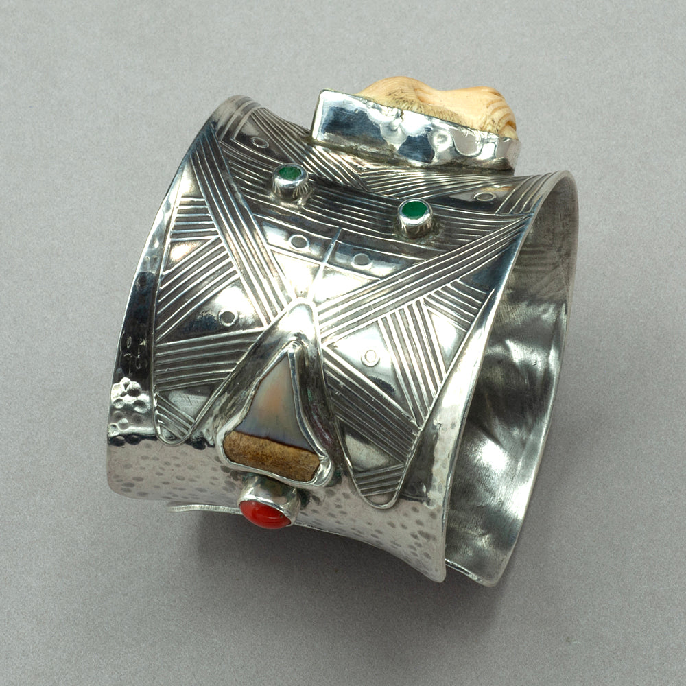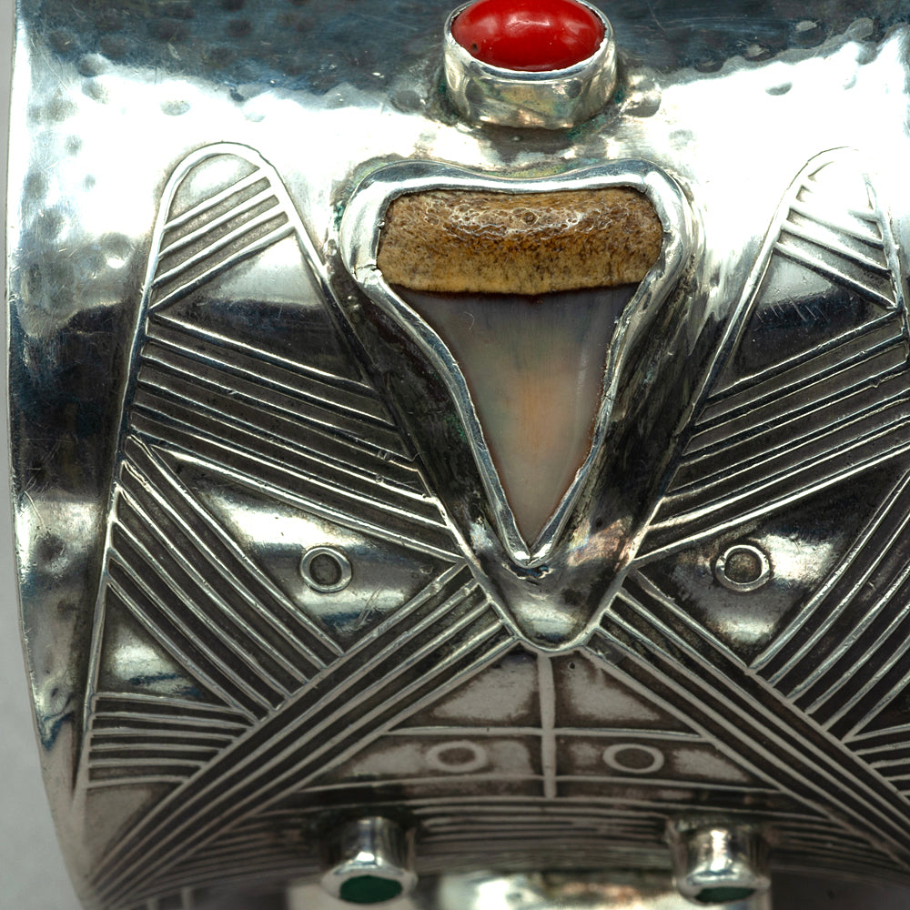 A Jaguar of carved bone is set with a fossil shark's tooth and coral bead, petrified palmwood and Chinese turquoise, two small emeralds and a sweet bronze face. This heavy gauge sterling silver cuff is embossed in a tribal pattern. This is a stunning of Tabra's best work and is a one of a kind. Measures: 1 5/8" W x 7" L with a 1" opening, and can be adjusted to fit a small to medium size wrist. rbj cuff9