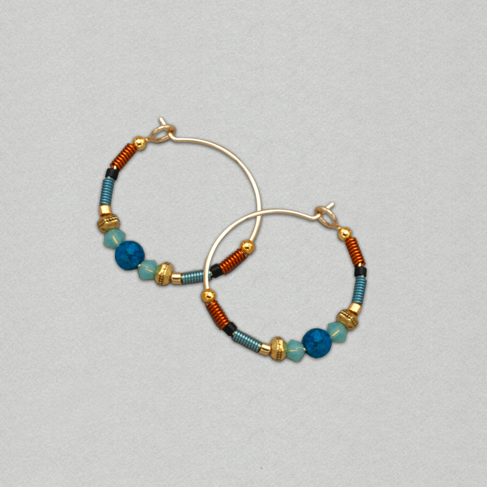 Dakota hoop earrings are just right for everyday. They are azurite-malachite-turquoise, crystal, glass beads, gold fill, nylon coated aluminum and niobium. Measures: 7/8" dia. hy 10057904es