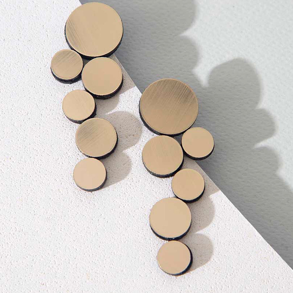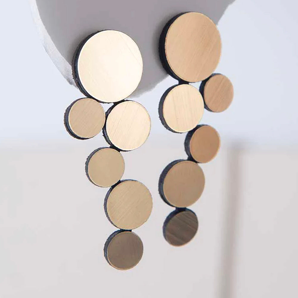 Inspired by the perfect geometry of the circle, Abstraction is both elegant and eye-catching. These drop earrings add sparkle and personality to any outfit. These large earrings are so lightweight and comfortable, you would almost forget you are wearing them. Acrylic and leather.