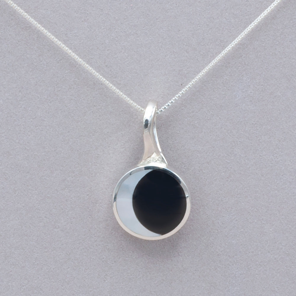 This sterling silver pendant is set with Mother of pearl & Black Onyx inlay - the perfect media to represent the crescent moon. Measure: 1/2" D. 18" sterling silver chain is included.