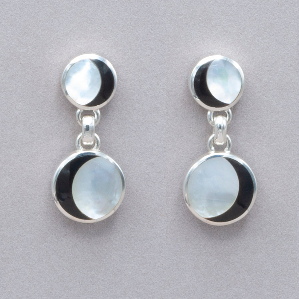 These sterling silver post earrings are set with mother of pearl & black onyx inlay - the perfect media to represent the phases of our moon. Measure: 1/2" D x 1" L.