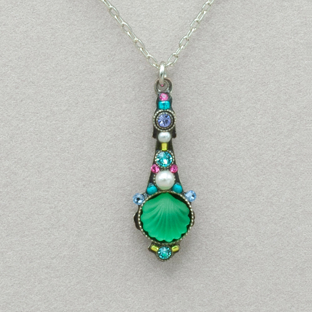 This intricately embellished mosaic necklace is comprised of European glass crystals and various other materials. Adjustable rhodium-plated chain measures 15 3/4" to 18". Pendant drop 1/2" diameter. ff 9256