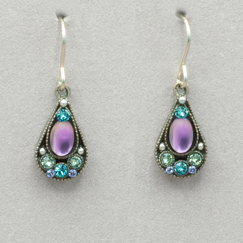 Made in Guatemala, these intricately embellished mosaic earrings are comprised of European crystals and various other materials. Sterling silver ear wires. 1 " L x 3/8" W. ff e579