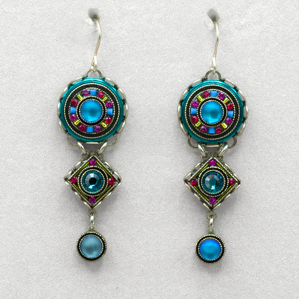 These intricately embellished mosaic earrings are comprised of European glass crystals and various other materials. Sterling silver ear wires. Measures: 2 1/8" long by 5/8" wide. ff e478