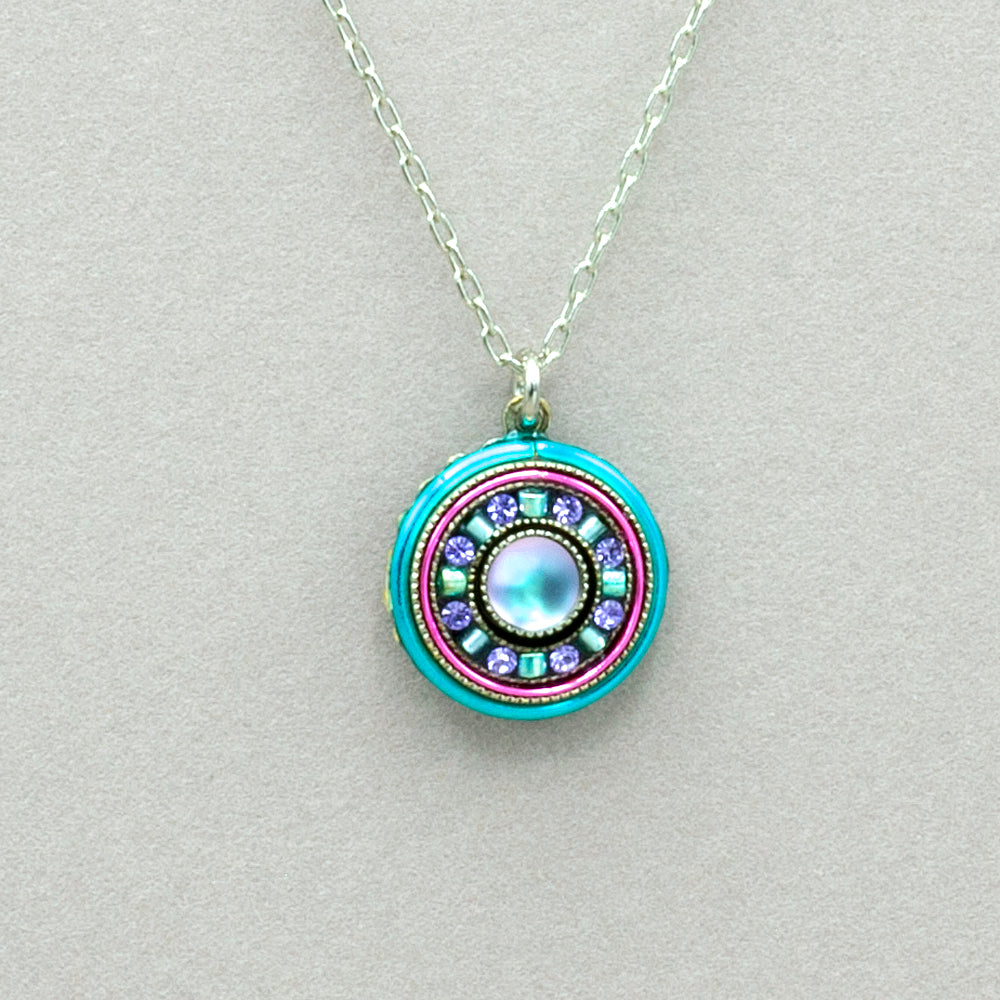 This intricately embellished mosaic necklace is comprised of European glass crystals and various other materials. Adjustable silver plated chain measures 15 3/4" to 18". Pendant drop 1/2" diameter. ff 9171