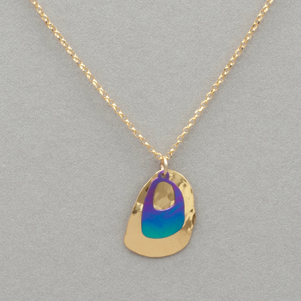 Holly"s signature bright niobium colors add to the glimmer of hand-hammered metal on this abstract form creates a small pendant of wearable art. Measures: Adjustable chain up to 20"; pendant 5/8” l. × 1/2” w. hy 10038117md