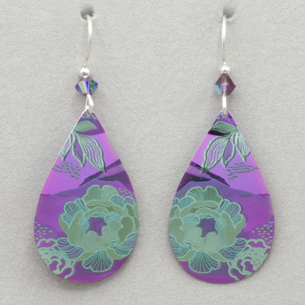 A romantic landscape in vibrant color features bold blossoms in the foreground. Niobium with sterling silver ear wires. Measures: 2" L × 3/4" W.