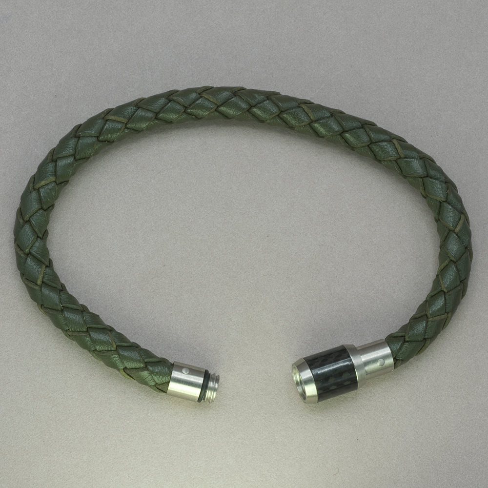 Army green leather bracelet with stainless steel and carbon fiber screw clasp. Measures 8.7" long. ital slb 228