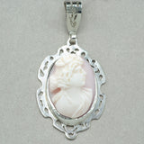 Jim has created a sterling silver lace-like frame for this one of a kind cameo of carved shell. One of a kind sterling silver pendant. Measures 2" long by 1" wide. jk p418