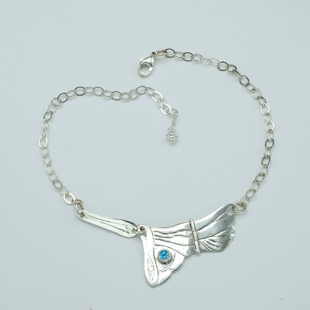 "Mercury's Wing" is a show stopper. Hinged sterling silver on a sterling silver chain, accented with a sparkling cubic zirconia. The hinge makes a perfect fit to any ankle. Lobster clasp. The sterling silver "wing" part, from side to side, measures 2 1/4" across. Length is adjustable up to 12". jk ank150