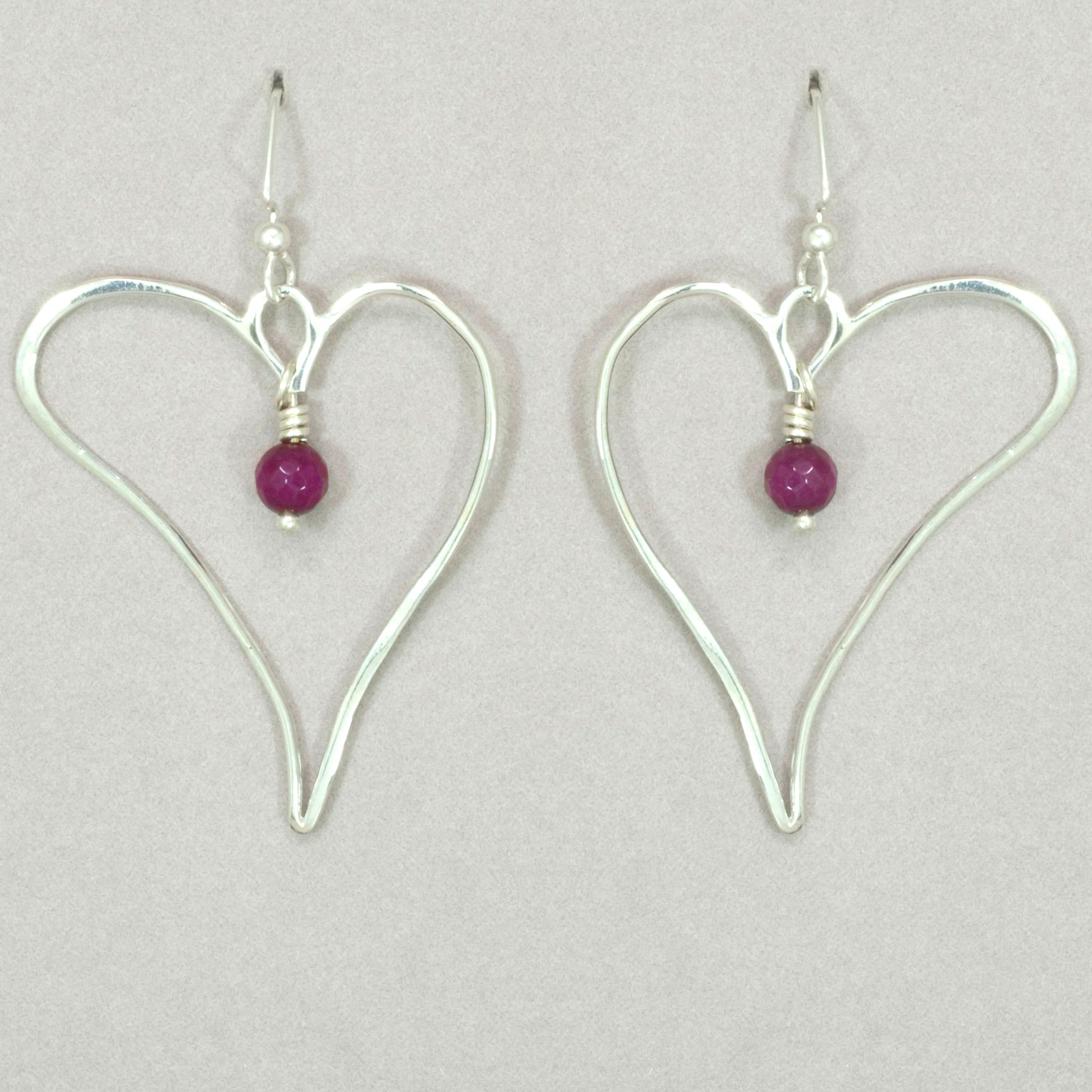 Free form style sterling silver heart surrounding a deep red garnet bead, suspended from sterling silver ear wires. The sterling silver heart measures 2 3/8" H x 1 1/2" W. (Please note: the earrings are handmade, so there may be some slight variation in size.) jk er050