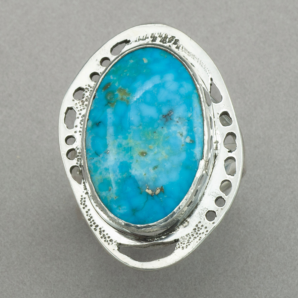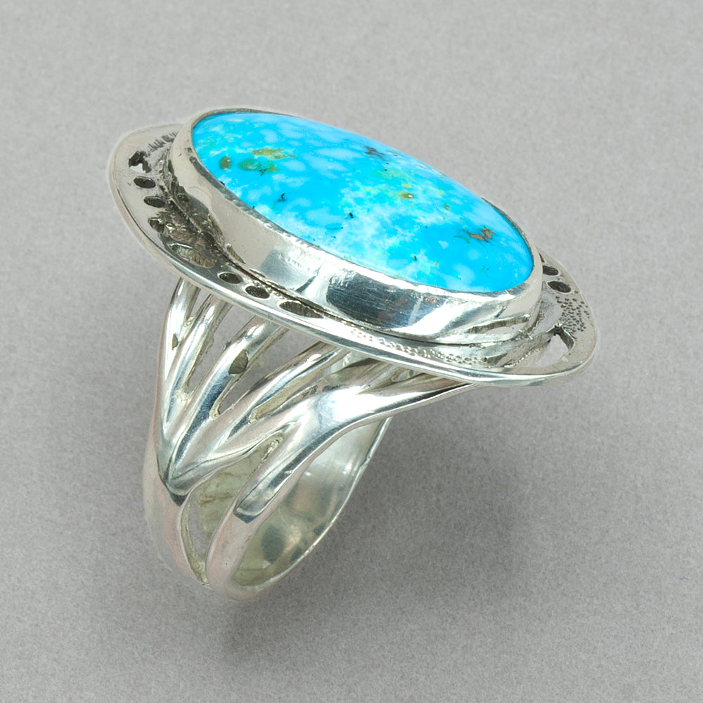 A large, beautiful turquoise stone set in hand chased sterling silver. Like no other, this Jim Kelly original is a show stopper. Measures:
