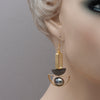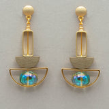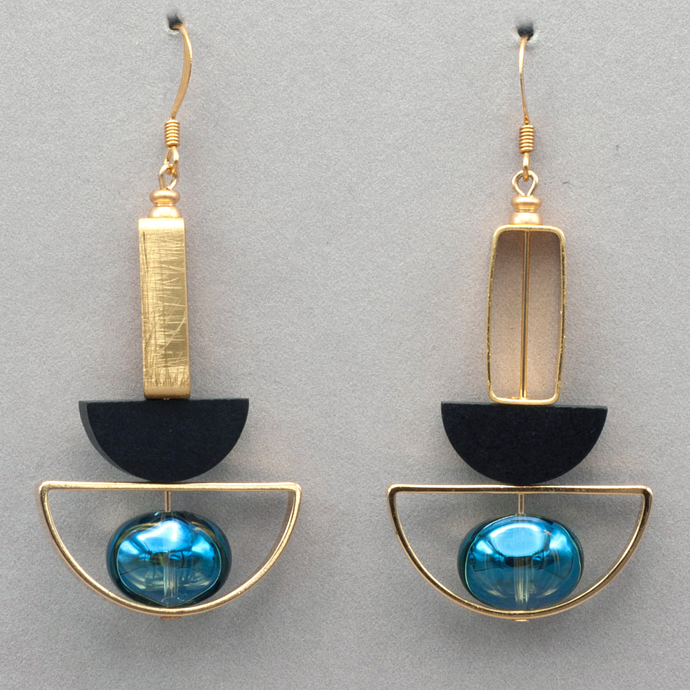 Gold toned or sterling silver plated metal with an anti-tarnish coating, with glass bead and wood accents. Hypo-allergenic posts/ear wires. Measures 2 1/2" L x 1 1/8" W. jmr 2002gfpost