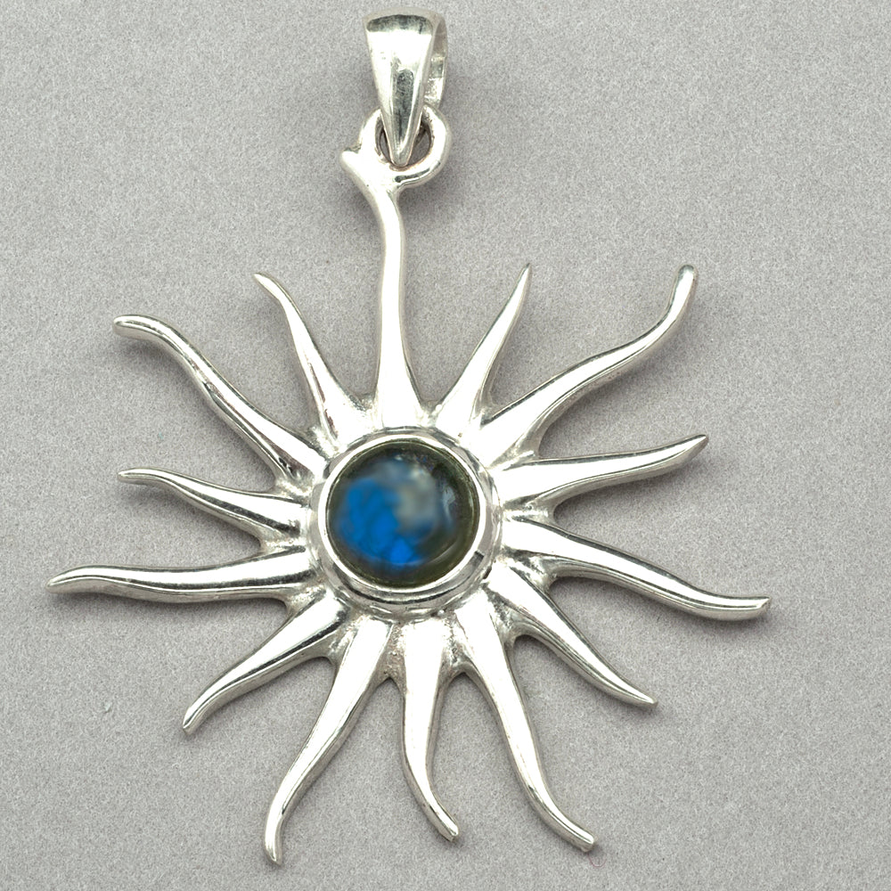Sterling silver sun pendant with labradorite. Measures 2 1/4" long by 1 3/4" wide. sam sunlg