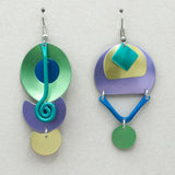 Anodized aluminum in primary colors on surgical steel ear wires. So cheerful! Measures: 1 1/4" W x 2 3/4" L. sh mmh