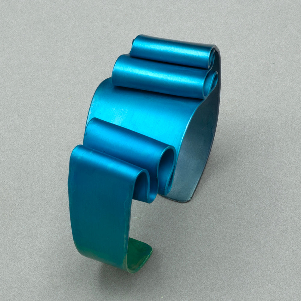 Anodized aluminum open cuff bracelet by Sylvi Harwin. Measures: 1 1/2" W x 7 1/4" D. sh cc